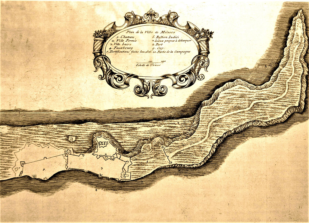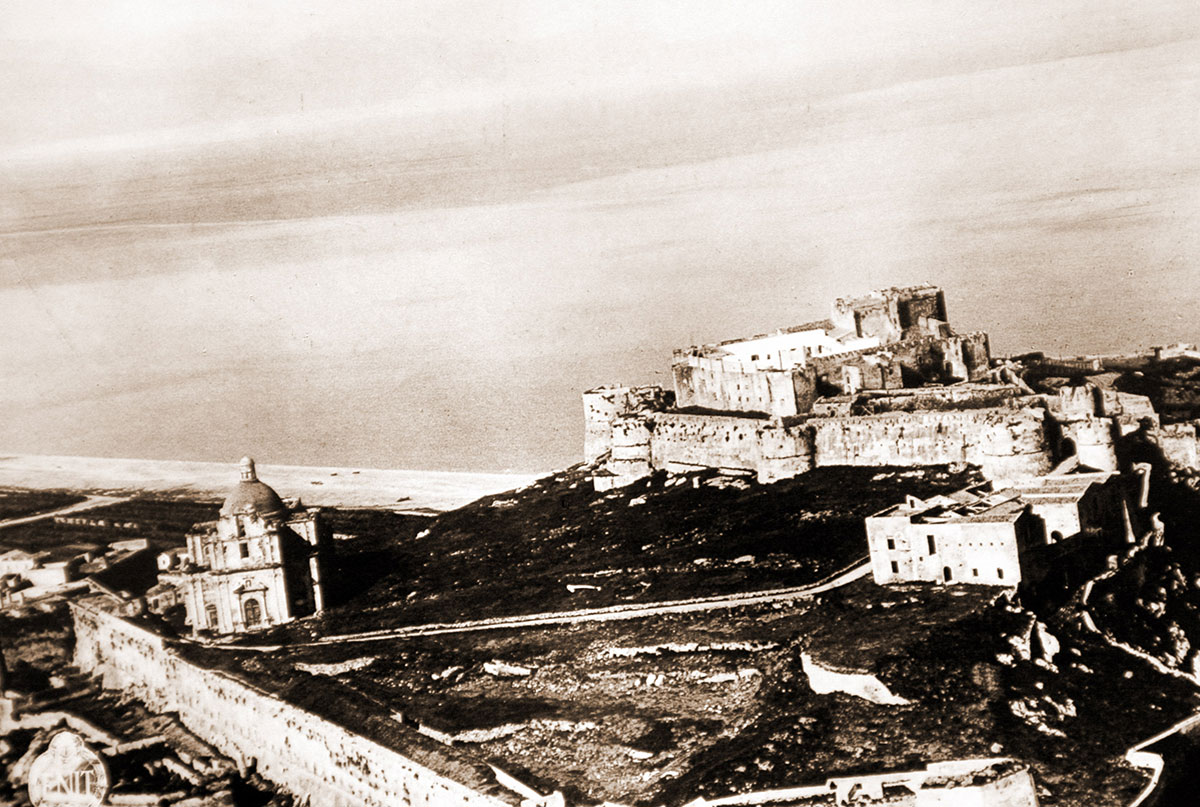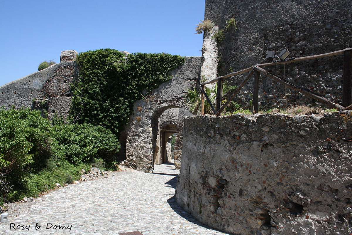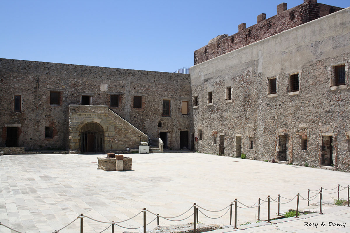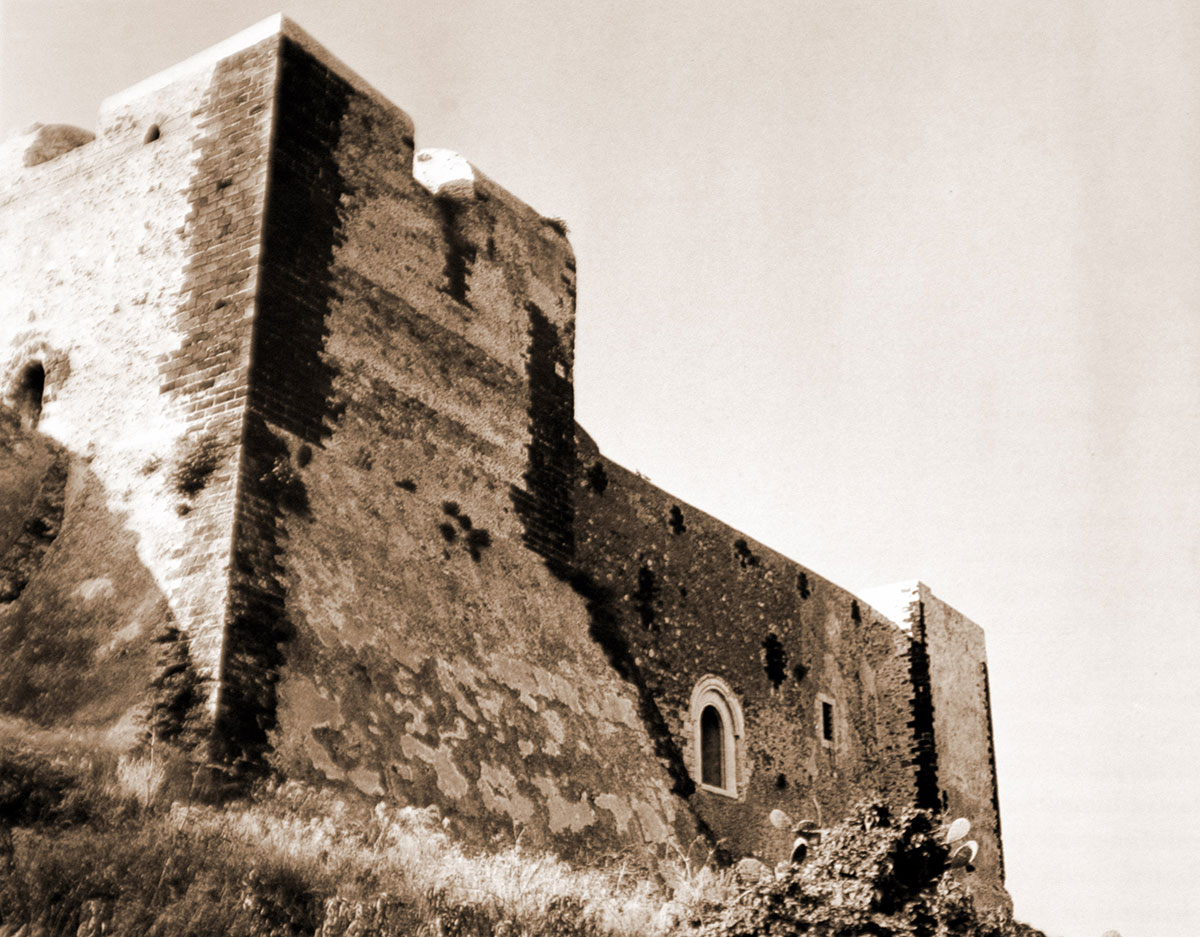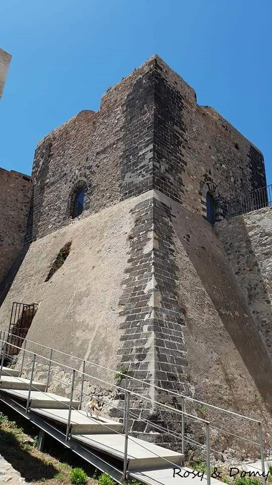 La cinta bastionata spagnola, la seconda e la più esterna, fu costruita tra il 1523 e il 1540. Il Bastione delle Isole, chiamato anche “delle sette porte”, rappresentava il baluardo di difesa nord della cittadella, costituito da locali ai quali si accede attraverso un portico più tardo, addossato alla cinta. La prima cinta di mura con le cinque robuste torri cilindriche scarpate venne eretta nel 1430 e completata nel 1456, come si legge nell’iscrizione tra le due finestre nel cortile sul prospetto occidentale. L’ultima, più antica e più elevata struttura fortificata, è quella di epoca sveva con torri a pianta quadrata, che rinserra la grande Piazza d’Armi. Su essa affacciano il Mastio e la Domus. Il primo, noto anche come “Torre Saracena” perché di impianto arabo con interventi di epoca normanna, occupa una posizione eminente che domina tutto il paesaggio circostante e rappresenta il primo elemento fortificato del castello. La Domus è un edificio a carattere residenziale come punto d’appoggio e di riposo per l’imperatore e i suoi seguaci, un’ampia sala di circa 106 mq. per un’altezza di 8,50 m., divisa in tre campate da archi-diaframmi ogivali in pietra lavica a sostegno dell’impalcato ligneo.