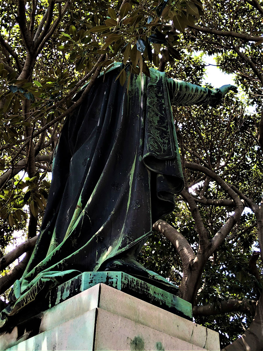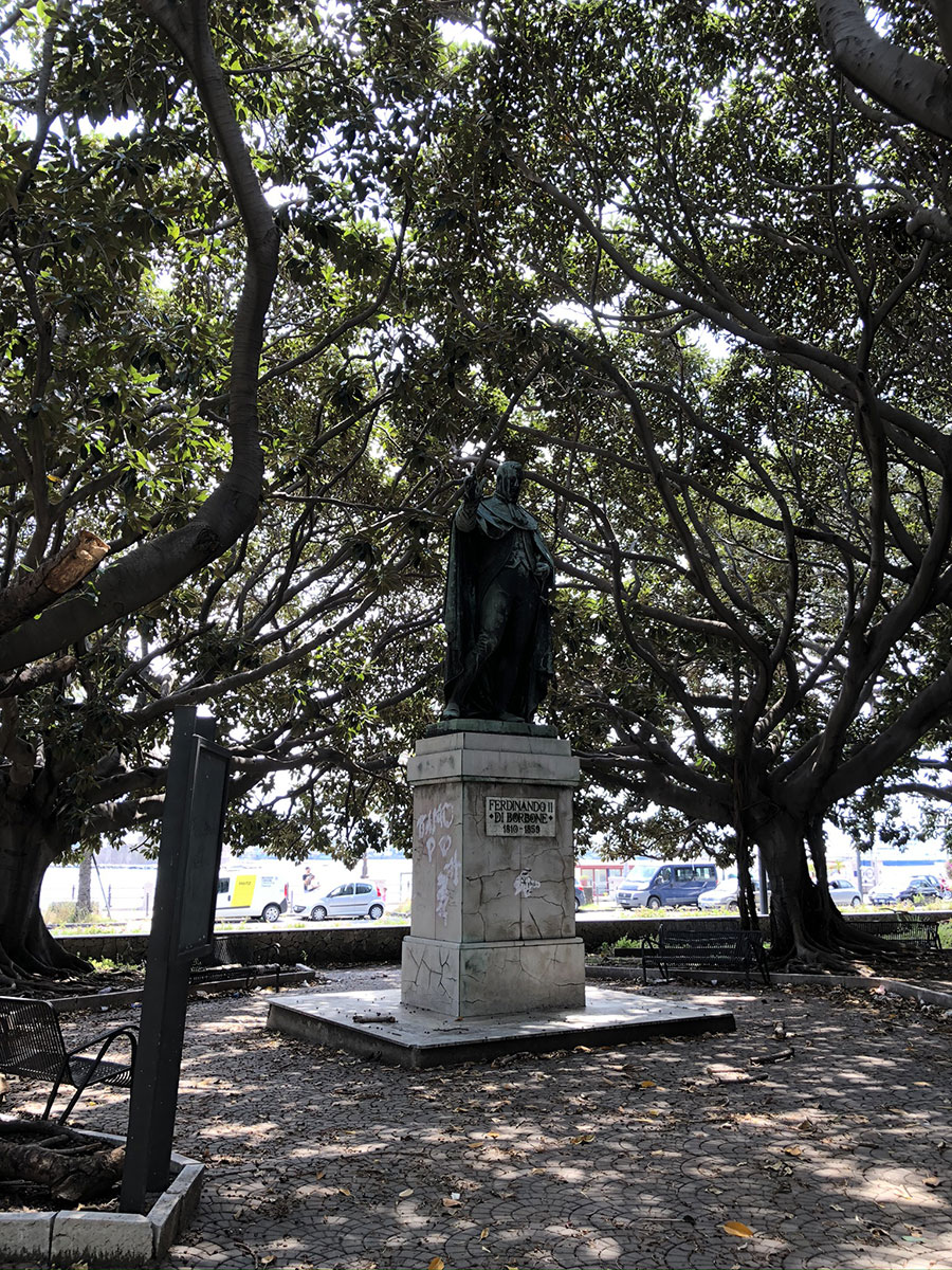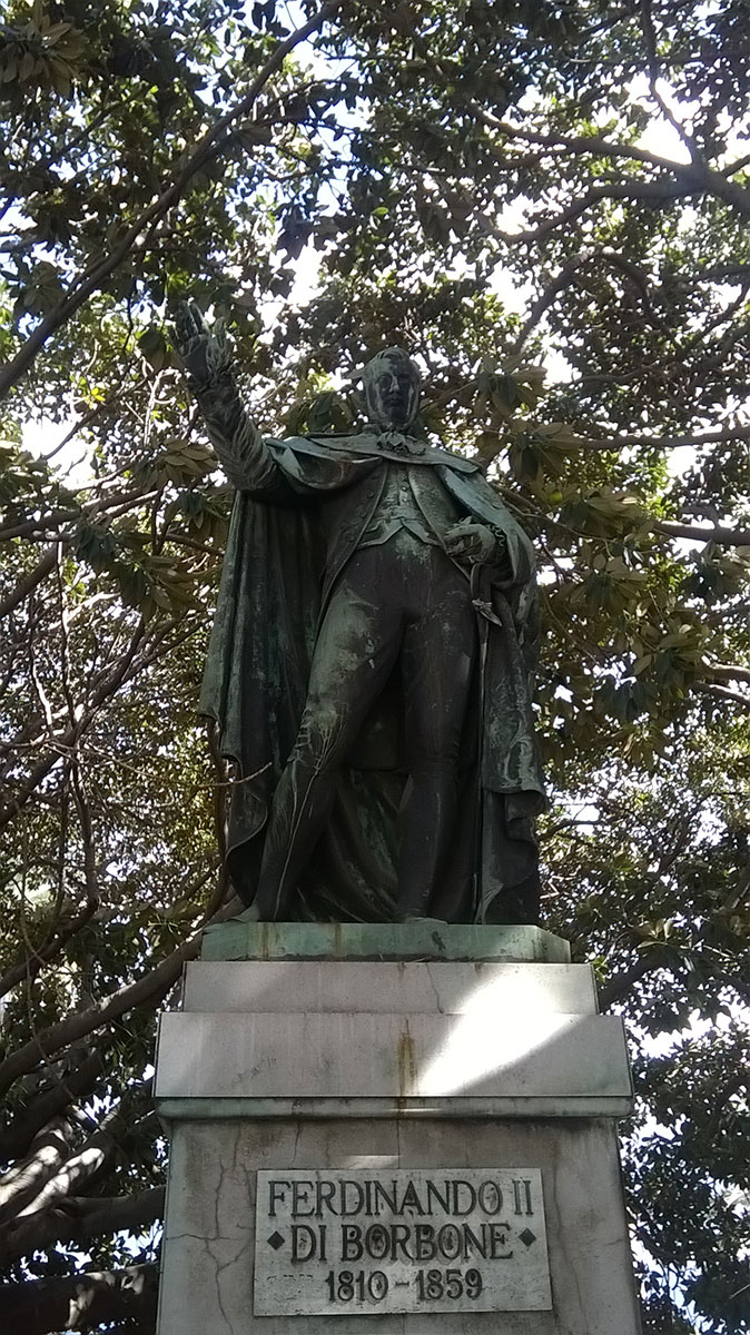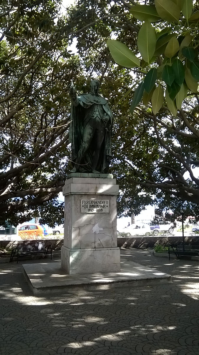 Dopo la distruzione della prima statua fusa a Monaco di Baviera nel 1839 e che era stata collocata solennemente in Piazza Duomo il 30 maggio 1845, il Decurionato messinese deliberò, il 20 novembre 1852, di rifarla e Pietro Tenerani la rifece simile alla precedente. Egli raffigurò il sovrano nell’abito di Gran Maestro dell'Ordine di San Gennaro, la cui insegna appare sul manto in corrispondenza della spalla sinistra, fondato da Carlo VII di Napoli che governò dal 1734 al 1759. La statua venne nuovamente rifatta e fusa a Monaco di Baviera presso la fonderia di Ferdinando von Miller, nel 1856. Industriale tedesco, dallo stabilimento di Miller uscirono le dodici statue colossali di bronzo raffiguranti i principali sovrani bavaresi, collocati nella Residenza dei re di Monaco di Baviera. Trasferita a Messina nel novembre 1857, la statua fu collocata in piazza Municipio. Da qui fu tolta dopo la caduta dei Borbone e trasferita nel Museo in San Gregorio. Dopo il sisma del 1908, venne sistemata nel Museo Nazionale e quindi, nel 1973, fu riconsegnata al Comune di Messina che la collocò nella villetta di Via Garibaldi. Sul basamento, si leggono le iscrizioni: “FERD. v. MILLER MUNCHEN” e “PIETRO TENERANI MDXXXLVII”