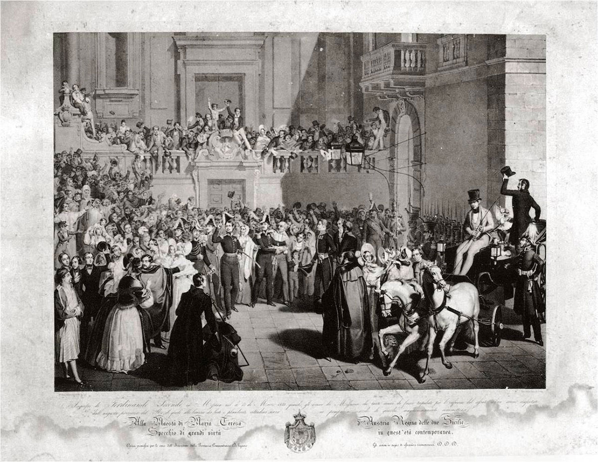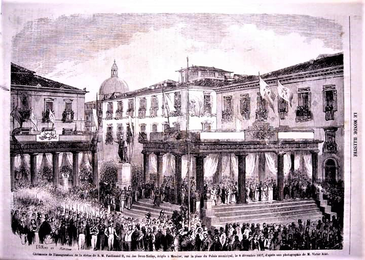 Con Carlo VII di Borbone, che entra a Messina il 9 marzo 1735, ha inizio la dinastia borbonica in Sicilia che durerà fino al 1860. Il 21 settembre 1830 sale al trono Ferdinando II di Borbone che viene in visita a Messina l’1 ottobre 1838 e accorda alla città alcune concessioni: la ripresa delle pubblicazioni dei giornali già soppressi dalla polizia; ripristina l’Università degli Studi che era stata soppressa dagli spagnoli all’indomani della fallita rivolta del 1674-78; ripristina il Portofranco, importante istituzione economica; emana un decreto per la costruzione del teatro “Santa Elisabetta”, divenuto dopo il 1860 “Vittorio Emanuele II”. Dopo due tentativi di insurrezione dei messinesi in conseguenza della mancata concessione di una “Carta costituzionale”, il 3 giugno 1847 la statua di Ferdinando II di Borbone in piazza Duomo, appare con le orecchie turate da bambagia e gli occhi coperti da una benda, a significare la regale sordità alla concessione delle riforme richieste dalla popolazione. Messina insorse contro i Borboni il 29 gennaio 1848, alle ore 9 antimeridiane. Vennero abbattute dal furore popolare le statue di Carlo III dello scultore Giuseppe Buceti, Francesco I di Letterio Subba e Ferdinando II del Tenerani.