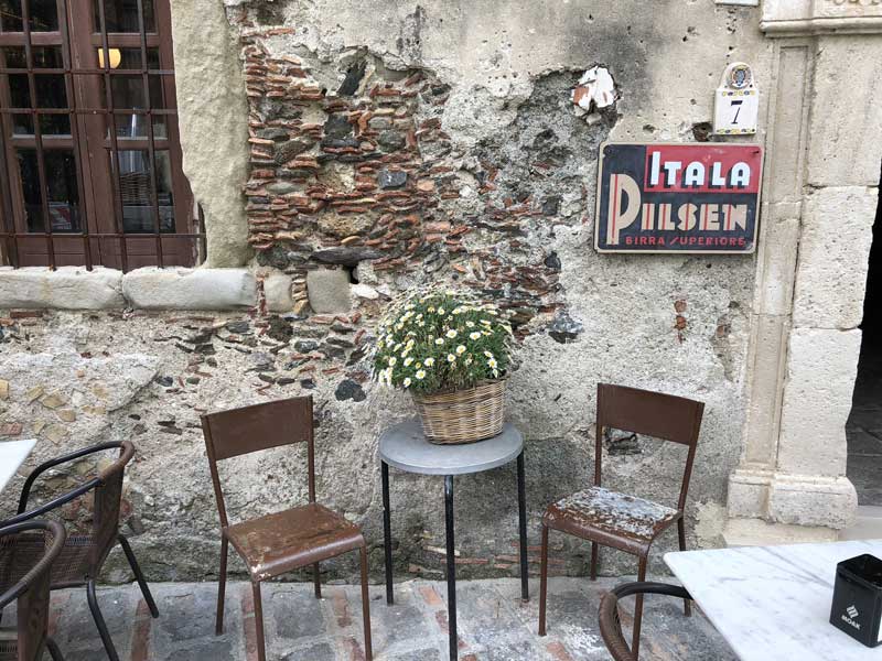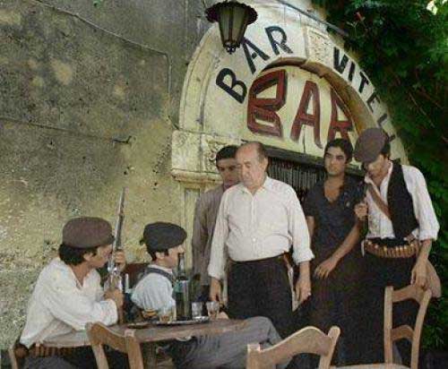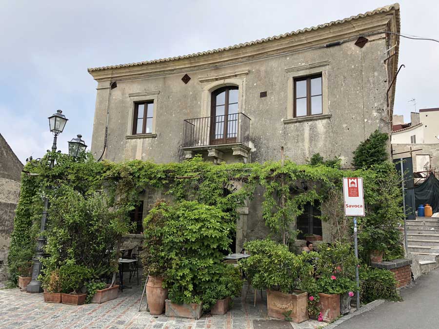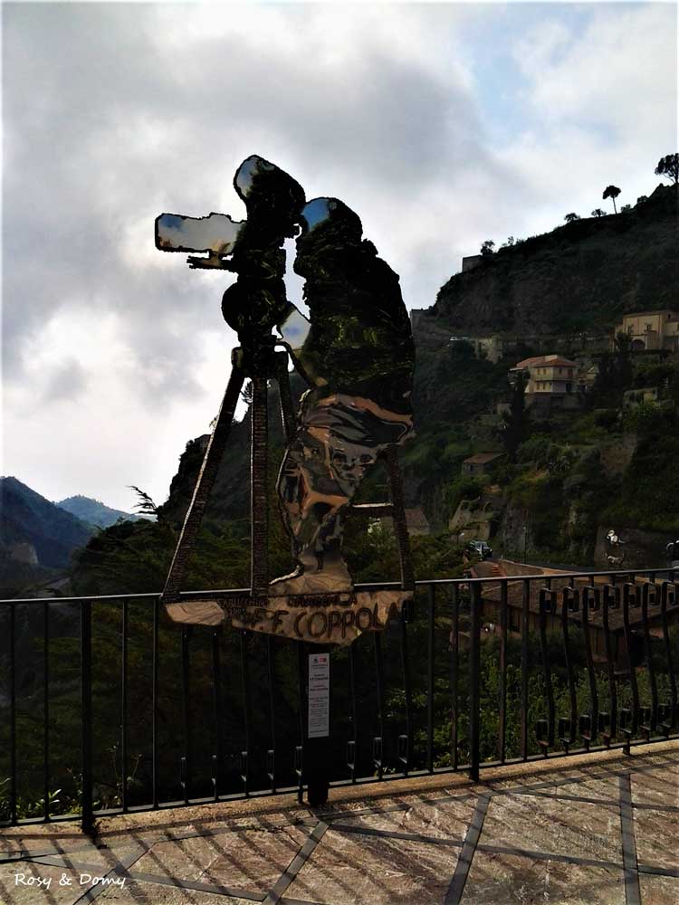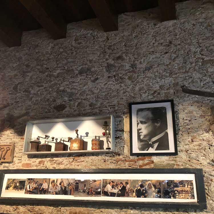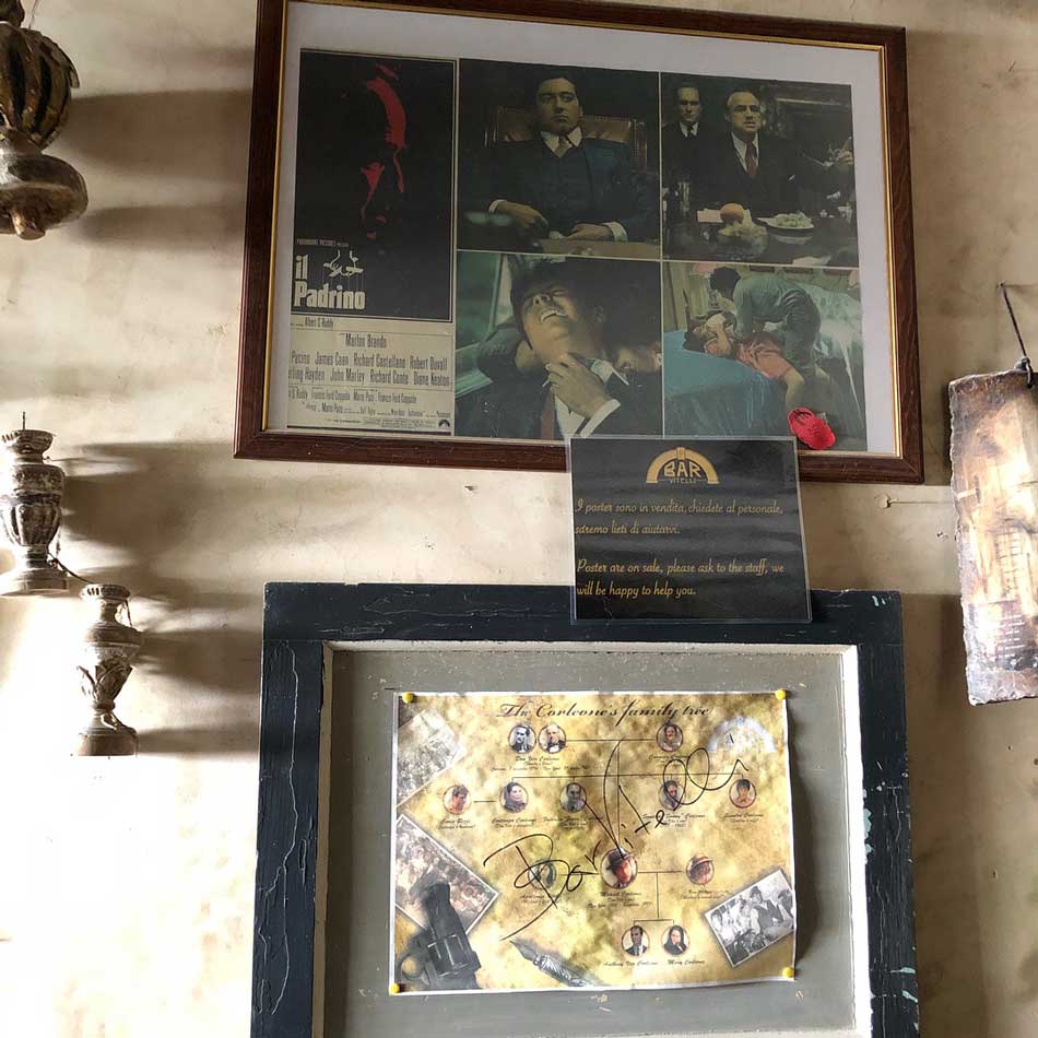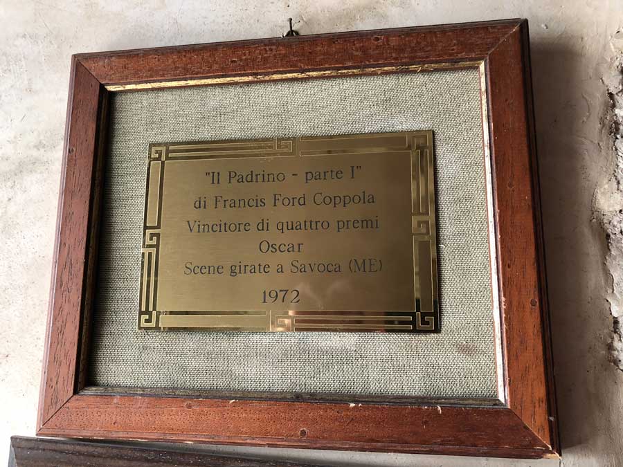 Francis Ford Coppola e Mario Puzo, autore dell’omonimo libro, per le riprese in Sicilia pensarono in un primo tempo a Corleone in provincia di Palermo ma la cittadina, nel 1971, era troppo moderna e non rispondeva ai requisiti richiesti di un paese siculo come doveva essere negli anni Quaranta del dopoguerra. Giunti in Sicilia, regista e troupe alloggiarono in un albergo a Taormina e in quell’occasione vennero in contatto col barone di Floristella Gianni Pennisi, affermato pittore a livello internazionale. Originario di Acireale e appartenente ad una delle più importanti famiglie nobili siciliane (il nonno, barone Salvatore Pennisi, fu grande numismatico), Gianni Pennisi era tenuto in grande considerazione nell’ambiente del cinema e indicò, per le scene del primo incontro di Michael Corleone con Apollonia Vitelli e successivo matrimonio, proprio il Borgo di Savoca che possedeva appieno tutte le caratteristiche richieste dalla sceneggiatura. Ad un primo sopralluogo, Francis Ford Coppola ne fu entusiasta e così il bar della “signorina Maria”, per esigenze di copione, fu trasformato nel Bar Vitelli con tanto di insegna dipinta sull’arco del portale e fu anche la fortuna turistica per Savoca.