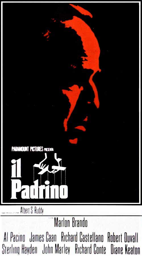 Liberamente tratto dal romanzo omonimo di Mario Puzo pubblicato negli Stati Uniti nel 1969, che ne curò la sceneggiatura insieme al regista Francis Ford Coppola, Il Padrino (The Godfather) è un film del 1972 interpretato da Marlon Brando con Al Pacino, James Caan, Robert Duvall, Sterling Hayden, John Marley, Richard Conte, Diane Keaton, Saro Urzì, con l’indimenticabile colonna sonora di Nino Rota. Ambientato a New York tra la fine degli anni ’40 e gli inizi degli anni ’50, è la saga criminale di una fra le più potenti famiglie mafiose di origine sicula in America il cui capo e protagonista del Film è don Vito Corleone (Marlon Brando), uomo con un suo codice d’onore che lo rende generoso con gli amici e implacabile con i nemici. Costruisce il suo impero nel gioco d'azzardo illegale e nella prostituzione coinvolgendo i figli e quando don Vito muore, il figlio Michael (Al Pacino) ne prende il posto e diventa il nuovo “Padrino”. La prima avvenne negli Stati Uniti, il 15 marzo 1972, col titolo The Godfather e in America incassò in totale la cifra record di oltre 135 milioni di dollari, fu premiato con tre Oscar ed ebbe due sequel, Il Padrino – Parte II (1974) e Il Padrino – Parte III (1990).