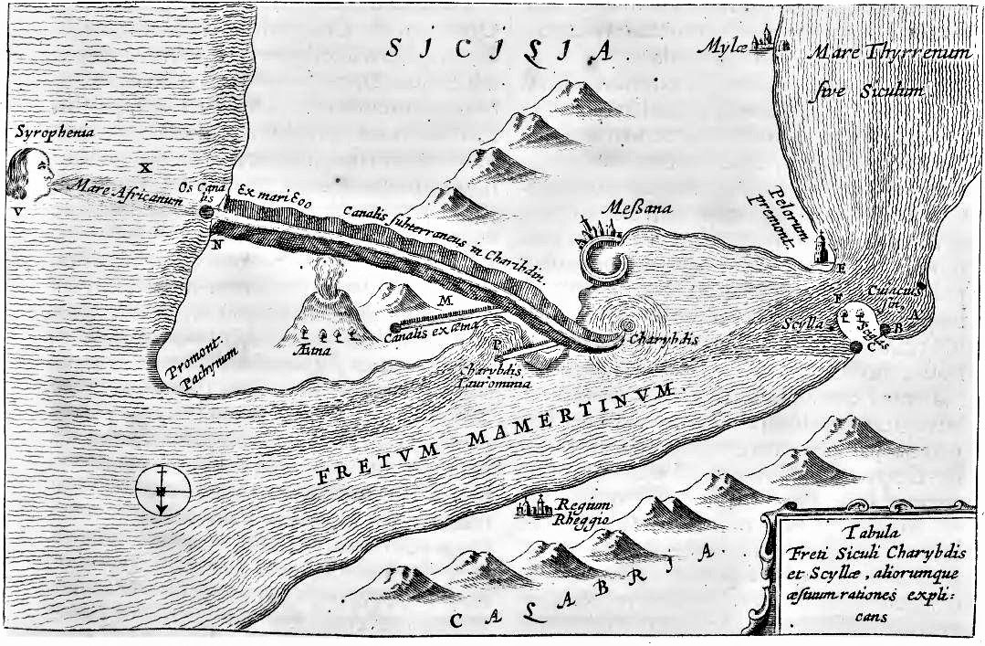 Lo Stretto di Messina con l’Etna ed un ipotetico canale causa dei gorghi tra Scilla e Cariddi, da Athanasius Kircher, Mundus subterraneus (