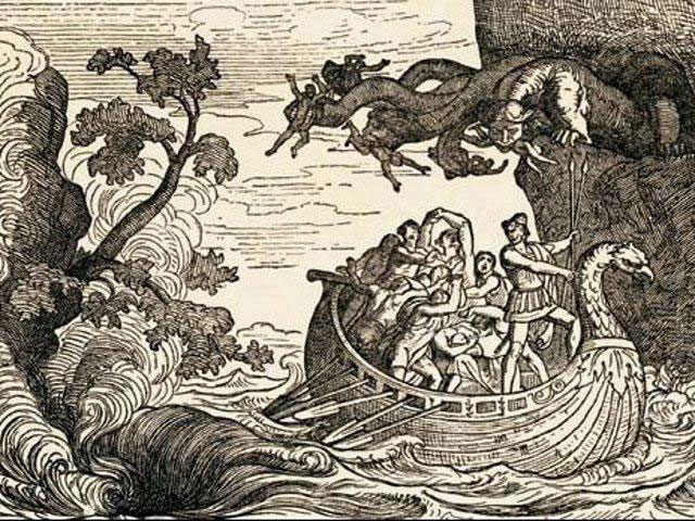 Scilla è un mostro atroce e spaventevole, che abbaia e ringhia orribilmente, localizzata su uno scoglio di una rupe alta cento metri nella punta calabra. È munito di 12 piedi e di 6 colli smisurati, portanti ciascuno una testa mostruosa guarnita da un triplice giro di denti acuminati. Tale mostro, antropofago, abita una oscura caverna da cui sporge la testa cercando avidamente la preda. Fra le grinfie del mostro periscono sei compagni di Ulisse. Scilla, in greco Skylla, deriva dal fenicio “sol” cioè pericolo, o dalla radice greca “skul” con significato di cane o anche di squalo. I cani urlanti nella cintura ricordano lo strepito particolare prodotto dalle onde che di continuo s’infrangono sotto le rupi cave. Scilla ci appare, fin dai tempi omerici, in relazione col cane e col cane accanto la troviamo rappresentata nelle monete di Turio, di Eraclea, di Taranto ed Ipponio. Cariddi, “ad un sol trar d’arco di Scilla” come dice Omero, è l’altro orribile mostro che tre volte inghiotte le acque del mare e tre volte le rigetta con muggiti, posta sotto il Promontorio Peloro. Cariddi, dal greco per “vortice”, o anche dal semitico “Khar” per “foro”, “voragine”, sarebbe espressione derivata in tal caso dai navigatori fenici.