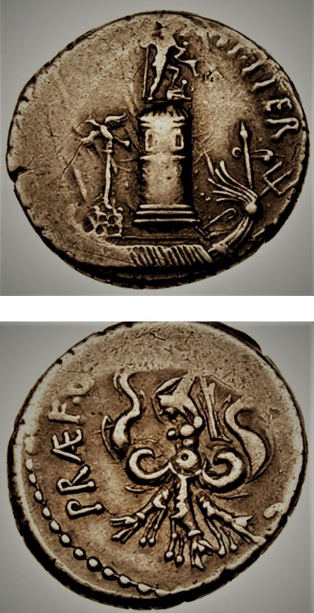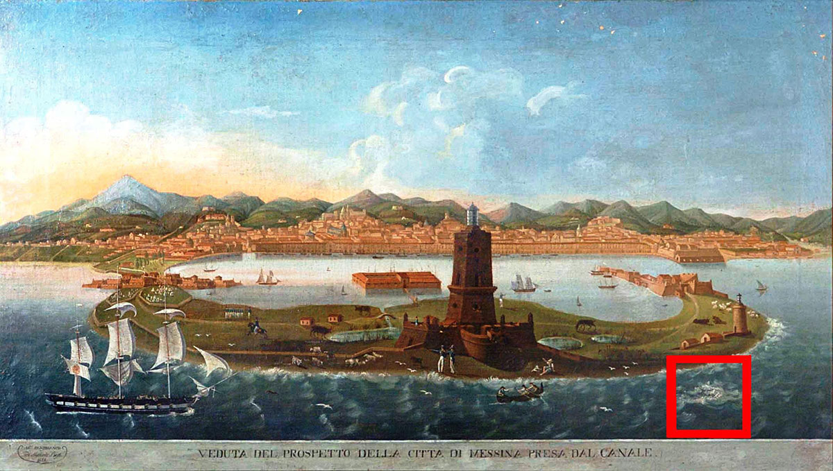 In una moneta romana (denario d’argento) coniata da Sesto Pompeo a Messina il 42-40 o 38-36 a.C., contemporanea al suo “dominio” sulla Sicilia e sullo Stretto, sul dritto è rappresentato il faro di Capo Peloro con una statua di Nettuno dotato di elmo, tridente e timone e col piede su una prua. Nel rovescio è raffigurata Scilla, il mostro della rupe calabra con due code di pesce e tre teste canine, secondo una delle tante iconografie conosciute