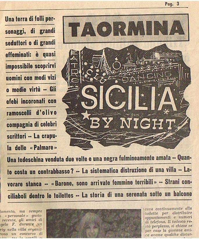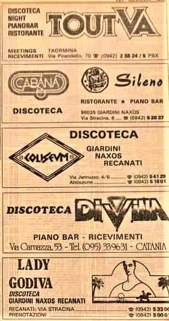 Uno dei locali cult di Taormina by Night è certamente il night club “La Giara” aperto nel 1953 da Chico Scimone, amico di Frank Sinatra e animatore della “dolce vita” taorminese, dove suonava il piano ed era accompagnato dal suo amico batterista Jimmy Falcone. Oggi lo storico locale, completamente rinnovato, continua la sua attività in Vico La Floresta 1 col ristorante e la discoteca dalle 23.30 alle 5.00. Altro locale storico, il “Tout Va”, era discoteca, ristorante e piano bar dove cantarono, tra gli altri, Ray Charles, Gilbert Becaud, Franco Califano, Gino Paoli, Ornella Vanoni, Patty Pravo, Barry White. Un enorme giardino che dal 17 luglio 1984 si impose come il locale fra i più frequentati in Sicilia quando Saro Fichera lo rilevò dal “Kursaal Casinò” a Villa Mon Repos. Fra i dj, Aax, Barry Mason, Leo Lippolis, Maurizio Presente e Alfredo Reni. Oggi è stato trasformato in un albergo di lusso. Il quattrocentesco Palazzo Ciampoli, tra il 1950 e la fine degli anni ’60, ospitò uno dei più rinomati night club di Taormina, il "Sesto Acuto", una location esclusiva e ricca di fascino. Locali storici erano anche il “Tiffany”, oggi in via San Pancrazio 5 e l’”Eden”, oggi “Septimo”, in via San Pancrazio 48.